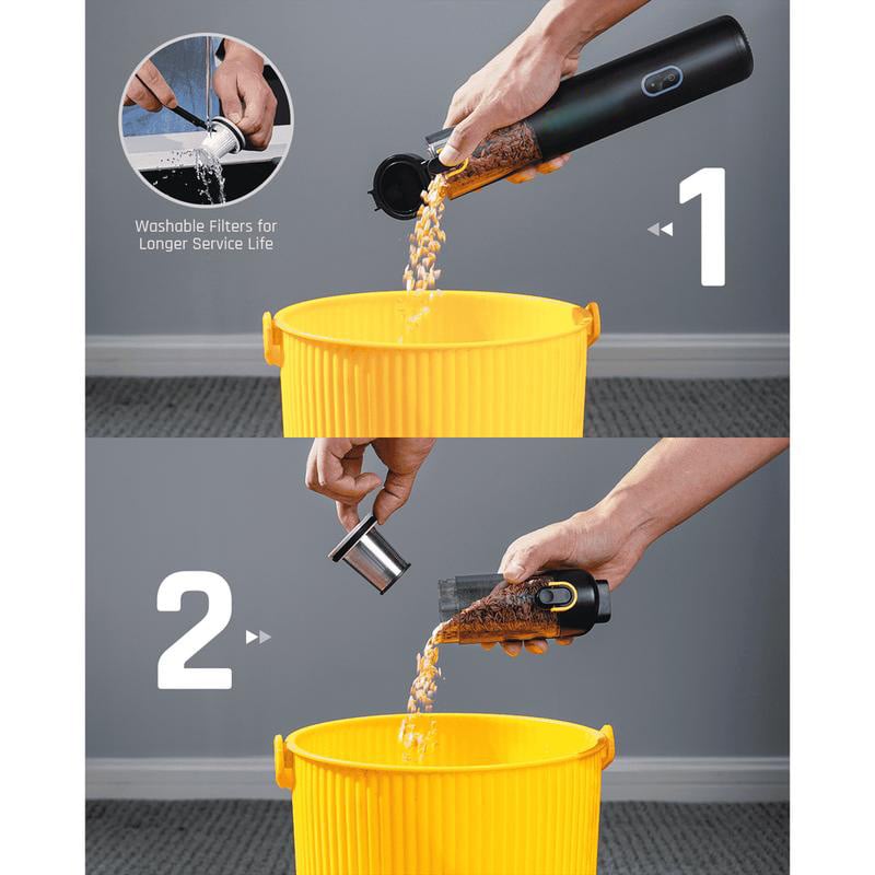 USB-C-Schnellladung – Verwenden Sie das Schnellladekabel Typ C, um ihn jederzeit und überall aufzuladen, und er kann in nur 2 Stunden vollständig aufgeladen werden. Lauflichtring, Betriebs-/Ladestatus auf einen Blick. Einfach zu reinigen – Mit nur einem Klick können Sie den Mülleimer leeren, ohne sich die Hände schmutzig zu machen. Das Schloss am Staubbehälter verhindert, dass der Staubbehälter versehentlich geöffnet wird. Edelstahl- und HEPA-Filter können für eine gründlichere Reinigung auch entfernt werden.