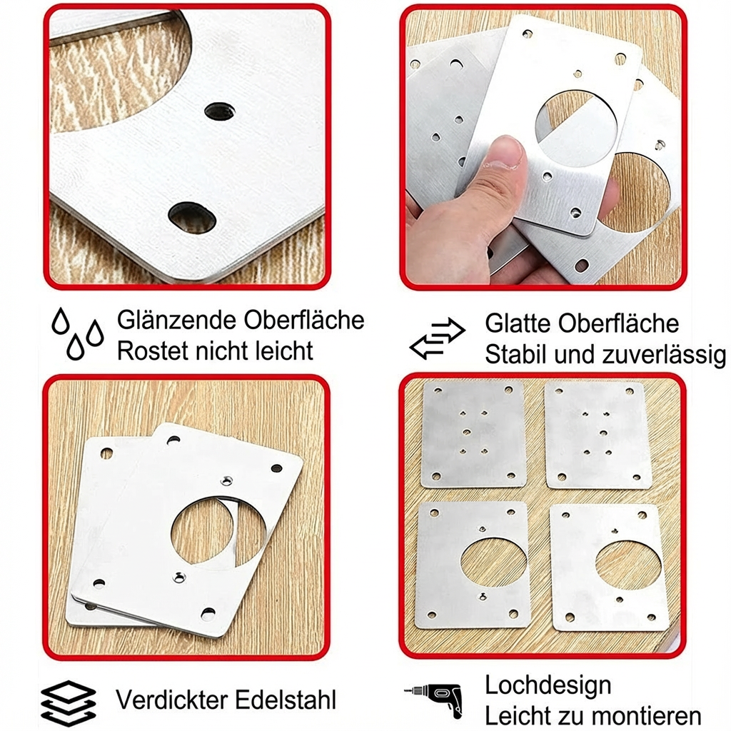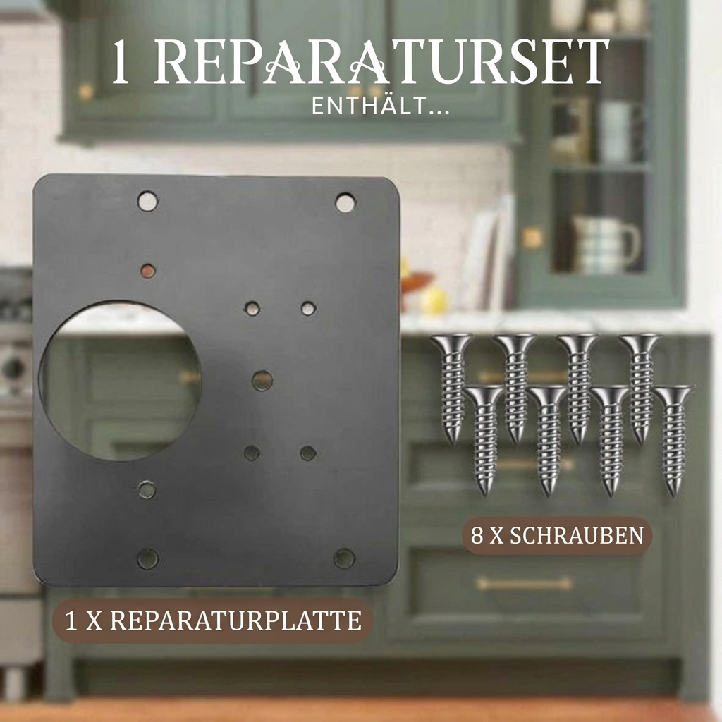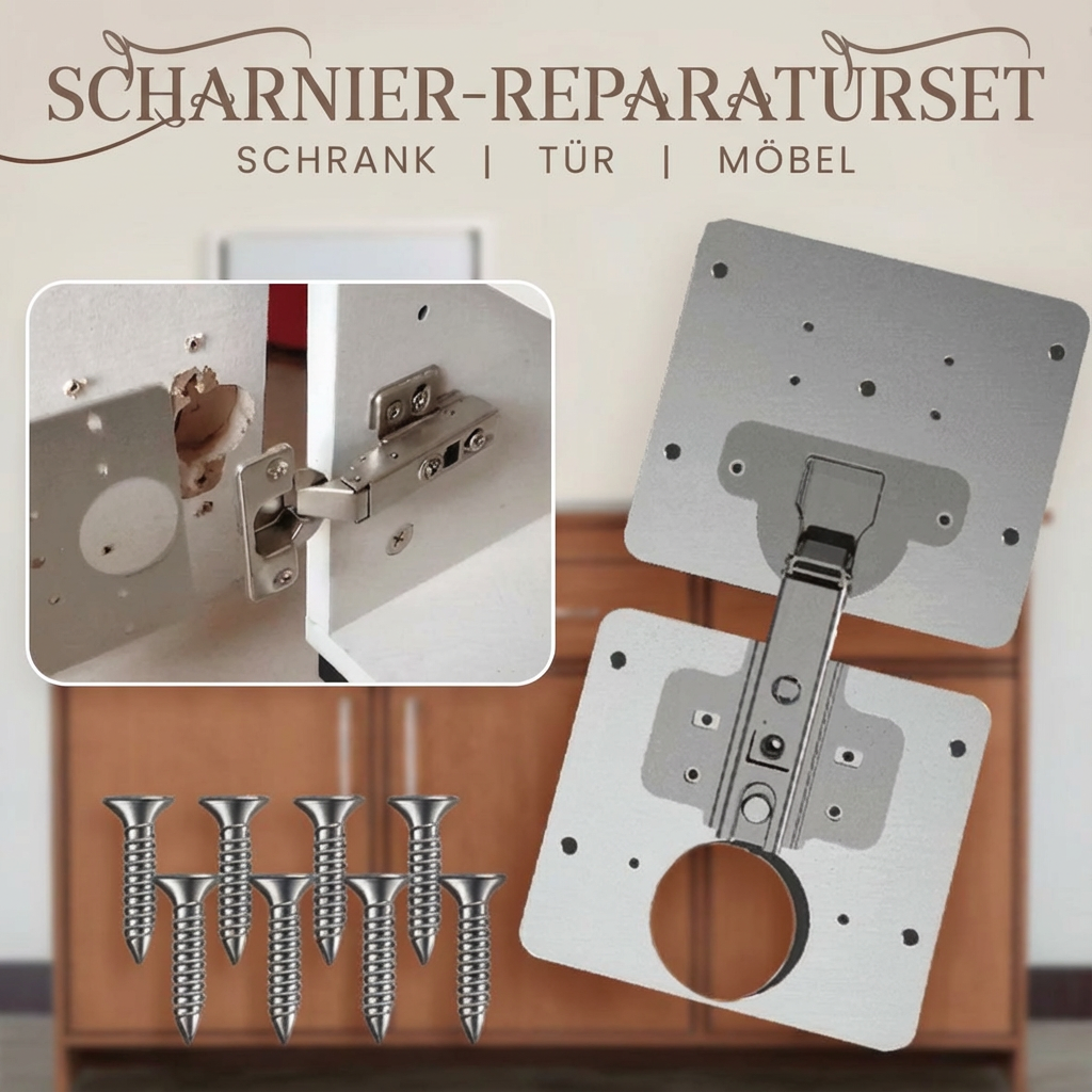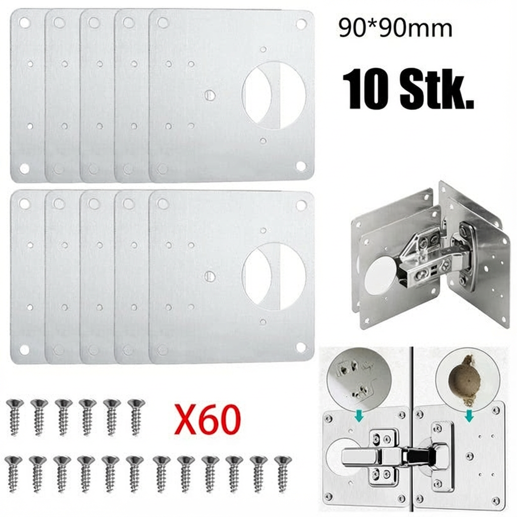 Dieses Scharnier-Reparaturset enthält alles, was benötigt wird, um jedes defekte, lockere oder verrostete Scharnier zu reparieren. Reparaturplatte am vorhandenen Scharnier ausrichten und festschrauben, um das Scharnier sicher zu fixieren.