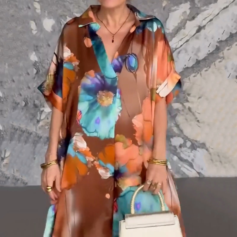 UNIQUE ARTISTIC FLORAL DESIGN: Adorned with vibrant, oversized floral patterns, this dress exudes an artistic charm. The bold color palette blends seamlessly, making it a standout piece for any occasion.